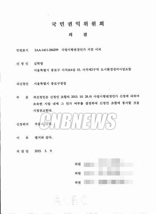 ▲‘종로구 사직2구역 재개발’의 조속한 시행을 권고한 국민권익위원회 의결서.