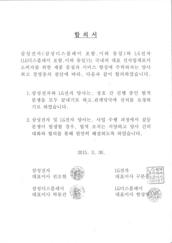 삼성전자와 삼성디스플레이, LG전자와 LG디스플레이는 31일 공동 보도자료를 통해 진행 중인 법적 분쟁을 모두 끝내기로 합의했다고 밝혔다.