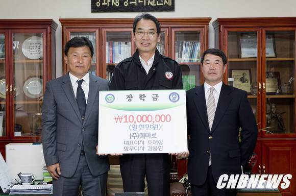 ▲▲ (CNB=최성락 기자) ㈜해마로(대표 조해상)는 31일 인제 군청을 방문해 지역인재 양성을 위해 써달라며 장학금 1,000만 원을 전달했다. 조해상 대표는 이번을 계기로 앞으로도 지속적으로 장학금을 기탁할 뜻을 밝혔다. (사진제공=인제군청)