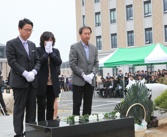 정해린 총장은 이날 추도사에서 “부산외국어대의 모든 교직원들과 학생들은 지난해 2월 리조트붕괴 사고로 안타깝게 희생한 9명의 학생을 영원히 기억하고자 교내에 추모비를 건립하게 됐다”며 “희생된 학생들이 꿈꾸었던 최고의 대학을 만들기 위해 모든 힘을 아끼지 않겠다”고 말했다.