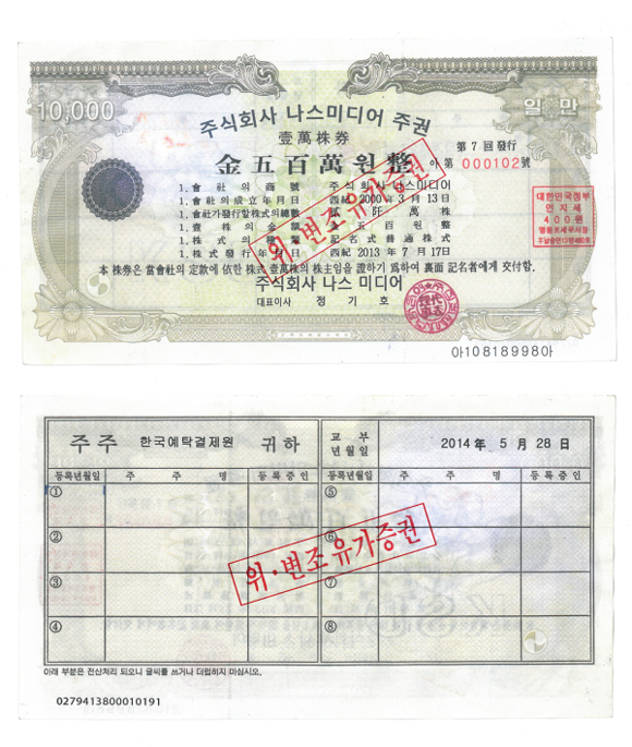 (CNB=최원석 기자) 한국예탁결제원(사장 유재훈)은 지난 1일 오후 4시께 증권회사로부터 주권을 예탁받는 과정에서 정교하게 위조된 ‘나스미디어’ 1만 주권 1매(1일 종가기준 시가 3억1300만원 상당)를 발견해 경찰에 수사의뢰했다고 2일 밝혔다.