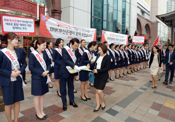 지난 3월 27일 지주사명을 BNK금융으로 바꾸고 새출발 한다는 의미로 부산은행 전 임직원이 ‘새롭게 새출발! With U, We do!’라는 슬로건으로 가두행사를 진행했다.