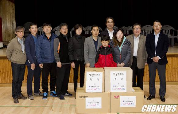 ▲▲(CNB=최성락 기자) 한국실업탁구연맹(회장 박주봉)은 2일 인제실내체육관에서 남면 부평초등학교 탁구부 학생 8명에게 선수 유니폼, 탁구공 및 양말 등 탁구용품 6백만 원 상당을 전달했다. (사진제공=인제군청)
