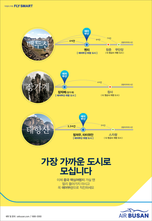 이로써 에어부산은 중국의 그랜드캐년 태항산 가는 길을 기존 대비 약 1시간 30분 단축하게 됐다. 뿐만 아니라 에어부산은 지난 1월 부산-옌지(연길) 취항으로 백두산 가는 길을 2시간, 4월 1일 부산-장자제(장가계) 취항으로 천문산 가는 길을 4시간 단축시킨 바 있다.