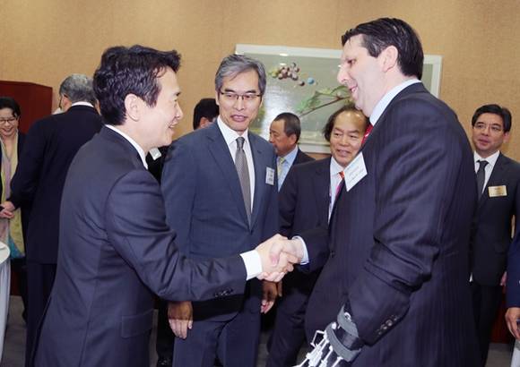 ▲남경필 경기도지사가 서울 모터쇼 개막식장에서 주한미국대사 마크 리퍼트를 만나 안부를 전하고 있다.(사진=경기도 제공)