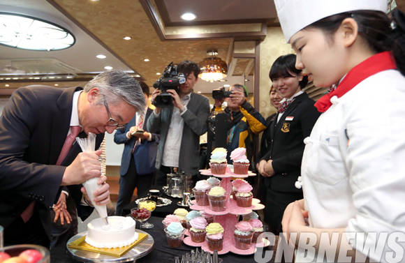 김종덕 문화체육관광부 장관이 3일 서울 중랑구에 위치한 송곡관광고등학교를 방문해 직접 케익 장식을 하고 있다. (사진=문화체육관광부)