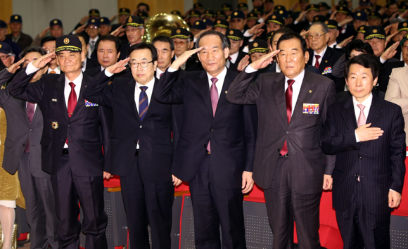 3일 오전 부산시청 1층 대강당에서 열린 자유민주수호 호국안보결의 및 북한이탈주민 격려행사에서 박승춘 국가보훈처장(오른쪽 3번째)과 서병수 부산시장 및 참석자들이 국민의례를 하고 있다. (사진제공=부산보훈청)