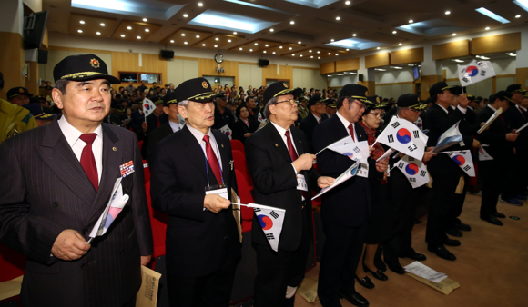 3일 오전 부산시청 1층 대강당에서 열린 자유민주수호 호국안보결의 및 북한이탈주민 격려행사에서 참석자들이 ‘우리의 소원’을 합창하고 있다. (사진제공=부산보훈청)