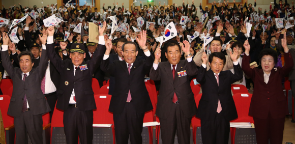 3일 오전 부산시청 1층 대강당에서 열린 자유민주수호 호국안보결의 및 북한이탈주민 격려행사에서 참석자들이 만세삼창을 하고 있다. (사진제공=부산보훈청)