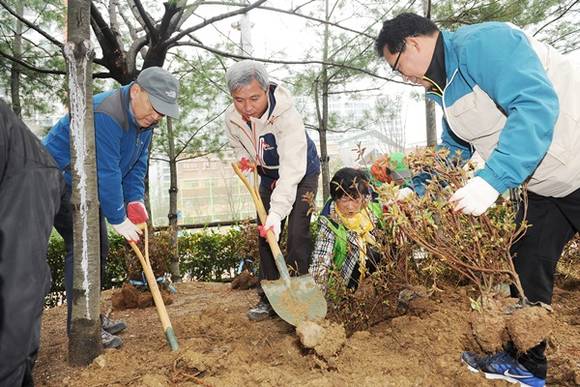 ▲곽상욱 오산시장이 지난 3일 식목일을 앞두고 시민들과 함께 나무를 심고 있다.(사진=오산시 제공)