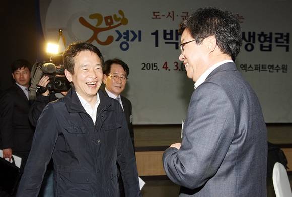 ▲3일 오후 안산 엑스퍼트 연수원에서 열린 "도-시군이 함께하는 1박2일 상생협력 토론회"에서 남경필 경기도지사가 염태영 시장군수 협의회장과 인사를 나누고 환하게 웃고 있다.(사진=경기도 제공)