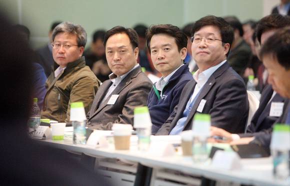 ▲4일 오전 안산 엑스퍼트 연수원에서 열린 "도-시군이 함께하는 1박2일 상생협력 토론회"에서 남경필 경기도지사가 토론에 경청하고 있다. 하지만 이번 토론회에서 화성 공동화장장에 관한 화성시와 수원시와의 이견차이로 협의점을 찿지못한 채 다음 기회에 재 논의 하기로 결정했다. 사진에서 우연찮게 채인석 화성시장이 (사진 맨 왼쪽)염태영 수원시장을 바라보는 눈빛이 무엇인가 갈구하는 듯한 묘한 표정을 짓고 있어 앞으로 화성 공동화장장과 관련해 화성시와 수원시의 갈등이 해소될지는 미지수로 남아 보인다.(사진= 경기도 제공)
