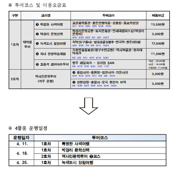 특히 작년과 달라지는 점은 이용 요금이 버스 차량비(3,000원), 관광지별 입장료, 체험료 등을 모두 포함한 통합 요금으로 코스별로 요금이 다르므로 반드시 확인 후 신청해야 하며 이용요금은 각 관광지의 협조를 받아 할인가가 적용된 금액이다.