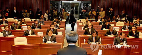 ▲새정치민주연합은 8일 배포한 자료를 통해 “차기 원내대표 경선을 4·29 재보궐선거를 감안해 다음 달 7일 실시하기로 했다”며 “후보 간 토론회 개최 여부는 추후 선관위원들과 협의해 결정하겠다”고 밝혔다. 새정치연합 의원총회 장면(자료사진=연합뉴스)