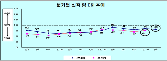 (CNB=최원석 기자) 9일 부산상공회의소(회장 조성제)가 부산지역 주요 제조업 190개사를 대상으로 실시한 ‘2015년 2/4분기 부산지역 제조업 경기전망 조사’ 결과에 따르면, 2/4분기 경기전망지수(BSI)는 ‘85’를 기록, 1분기 대비 3p 하락한 것으로 나타났다.