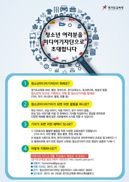 경기도교육청은 청소년이 스스로 경기교육을 비롯한 교육관련 내용에 대해서 취재하고 블로그, 팟캐스트 등 다양한 매체를 통해서 세상과 소통할 수 있도록 오는 5월 청소년미디어기자단(가칭)을 출범한다. 이를 위해 도내 청소년을 대상으로 4월 10일부터 17일까지 기자단 지원서를 이메일(humantree@goe.go.kr)로 접수한다.