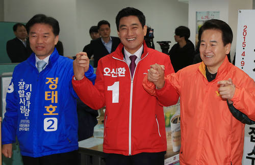 ▲4.29 재보궐선거 후보자 등록이 시작된 9일 오전 서울 관악구 청룡동 관악선거관리위원회에서 관악을 국회의원 보궐선거에 출마한 후보들이 후보자 등록에 앞서 손을 맞잡고 있다. 왼쪽부터 새정치민주연합 정태호 후보, 새누리당 오신환 후보, 국민모임 정동영 후보.(사진=연합뉴스)