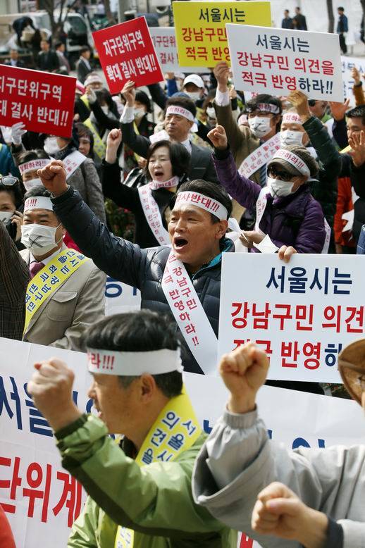 ▲강남구민들이 8일 서울시청 앞에서 현대차그룹이 매입한 한국전력 부지 개발과 관련, 지구단위계획구역 확대 반대 시위를 벌이고 있다. (사진=연합뉴스)
