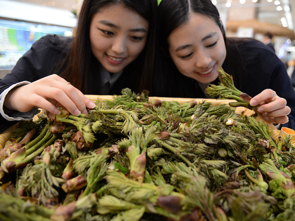 롯데백화점 광복점 지하 1층 식품관에서는 경남 남해에서 수확한 참두릅을 선보여 여성고객들이 살펴보고 있다. (사진제공=롯데백화점 광복점)