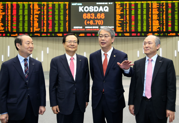 임종룡 금융위원장이 10일 증권시장의 IT현황 및 보안상황 점검을 위해 한국거래소 통합IT관제센터를 방문해 브리핑을 받고 홍보관을 둘러봤다. 사진 왼쪽부터 권영상 거래소 상임감사, 최경수 거래소 이사장, 임종룡 금융위원장, 정연대 코스콤 사장. (사진제공=거래소)