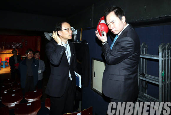 이날 안전지원센터 전문가, 종로 소방서, 소극장협회 관계자들과 함께 소화기 배치 안내도 없이 구석에 자리 잡고 있는 소화기의 사용가능 여부를 점검해 보고 있다. (사진=문화체육관광부)