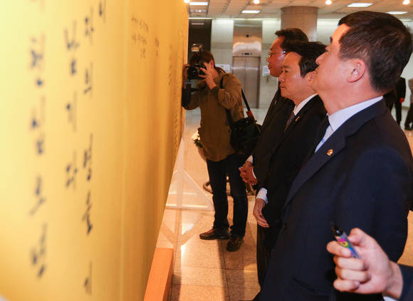 경기도의회는 13일 1층 로비에서 경기도의회 의장, 경기도지사, 경기도 교육감 등을 비롯한 도의원, 도청 및 교육청 임직원 등이 다함께 세월호 추모의 벽에 희생자를 추모하는 메시지를 남겼다.