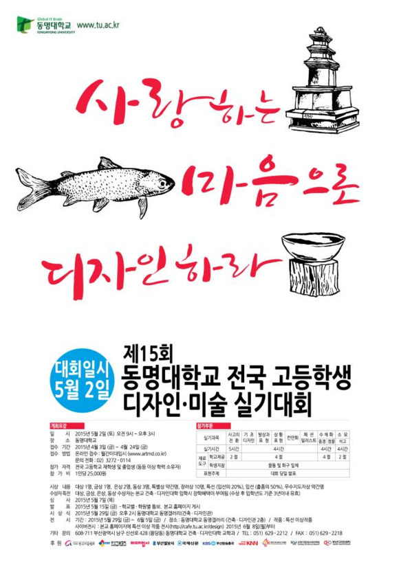 (CNB=최원석 기자) 동명대학교(총장 설동근)는 5월 2일 오전 9시부터 오후 3시까지 건축·디자인관에서 ‘제15회 전국 고교생 디자인·미술 실기대회’를 개최한다고 13일 밝혔다.