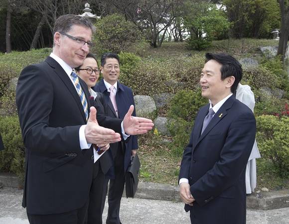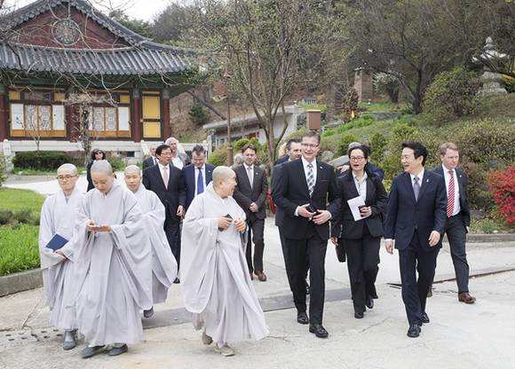 ▲13일 오후 수원 봉녕사 에서 남경필 경기도지사가 독일 연방 하원 대표단과 환담을 하고 있다.(사진=경기도 제공)