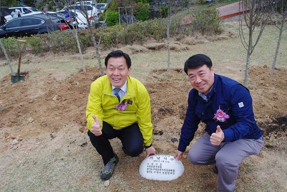 ▲이재준 수원시 제2부시장과 (좌측)이재익 수원보훈지청장이 기념식수를 하고 기념촬영을 하고 있다.
