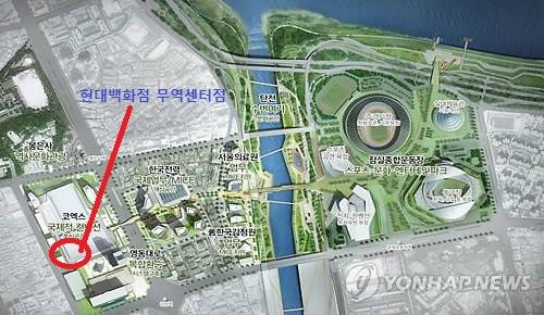 ▲현대백화점그룹은 코엑스(무역센터)∼한전∼서울의료원∼옛 한국감정원∼잠실종합운동장 일대 72만㎡ 규모의 국제교류복합지구 내에 위치한 현대백화점 무역센터점(빨간색 원)에 면세점을 열겠다고 공언했다. (사진=서울시)