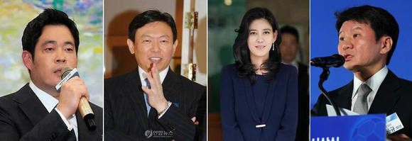 ▲최근 중국관광객이 급증하면서 면세점사업이 ‘황금알을 낳는 거위’로 인식되고 있다. 면세점사업권을 두고 치열한 경쟁을 벌이고 있는 정용진 신세계 부회장, 신동빈 롯데그룹 회장, 이부진 호텔신라 사장. 정몽규 현대산업개발 회장 (왼쪽부터) /사진=연합뉴스