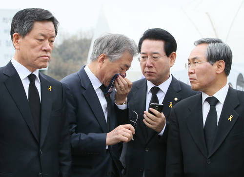 ▲새정치민주연합 문재인 대표가 16일 경기 안산시 단원구 세월호사고희생자정부합동분향소에서 조문한 뒤 눈물을 닦고 있다. 왼쪽 부터 주승용 최고위원, 문 대표, 김영록 의원, 우윤근 원내대표. (안산=연합뉴스)