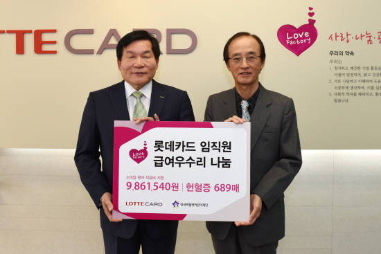 롯데카드는 17일 서울 중구 소월로 본사에서 지난 한 해 동안 임직원이 기부한 사회공헌기금과 헌혈증을 한국백혈병어린이재단 부산 나음소아암센터에 전달했다고 밝혔다.