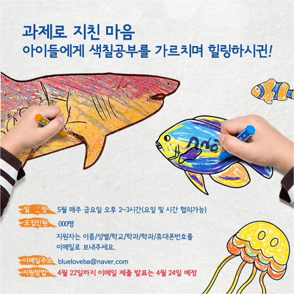 부산아쿠아리움은 다음 달부터 매주 1회씩 정기적으로 ‘아트 아쿠아리움’을 방문한 관람객들에게 색칠공부를 지도할 미대생 재능기부 지원자 신청접수를 시작한다고 20일 밝혔다.