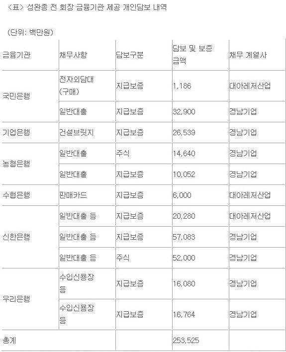 경남기업의 감사보고서와 재벌닷컴에 따르면, 작년 말 현재 성 전 회장이 국내 은행들에 개인적으로 제공한 주식과 지급보증액은 모두 2535억원으로 집계됐다.