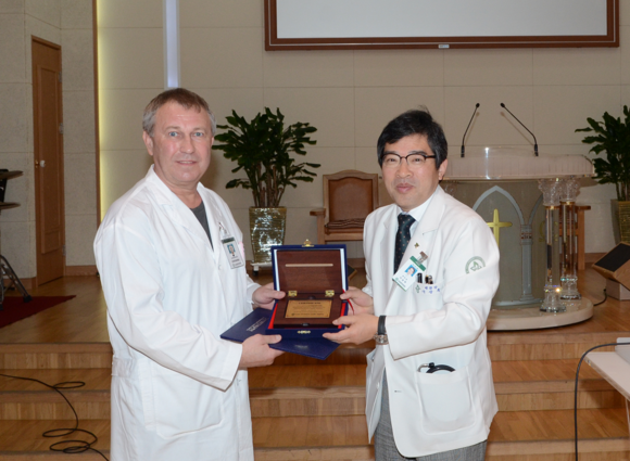 ▲이상욱 고신대복음병원장(오른쪽)이 러시아 외과의사인 리트비넨코 유리씨에게 연수 기념 인증서를 전달하고 있다. (사진제공=고신대복음병원)