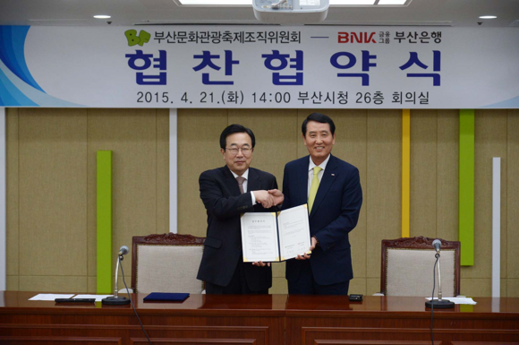 (CNB=최원석 기자) BNK금융그룹(회장 성세환) 부산은행이 21일 오후 부산시청 회의실에서 부산문화관광축제조직위원회 위원장인 서병수 부산시장과 부산 문화와 지역 축제 발전을 위해 연간 3억7천만원을 후원하는 협약식을 가졌다.
