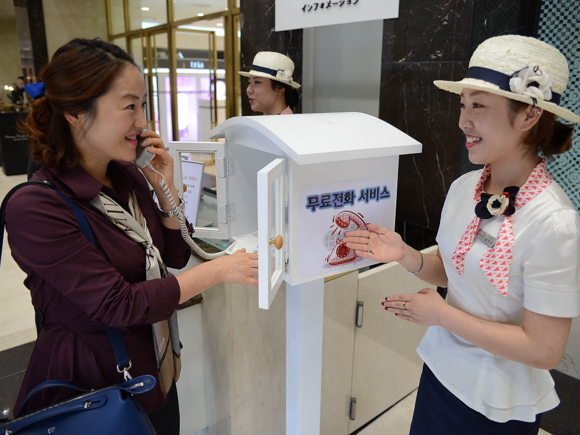 ▲롯데백화점 부산본점 1층 정문 안내데스크에서는 전화가 필요한 고객들을 위해 ‘무료 전화 서비스’를 제공해 좋은 반응을 얻고 있다. (사진제공=롯데백화점)