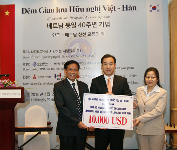 (CNB=최원석 기자) BNK금융그룹 부산은행(회장 성세환)은 지난 22일 베트남 하노이 대우호텔에서 열린 ‘한국-베트남 친선 교류의 밤’에 참석해 베트남 고엽제 피해 환자 돕기 성금 1만불을 전달했다고 23일 밝혔다.