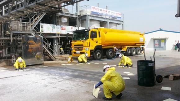 이날 모의훈련은 탱크로리에 남은 유기용제(IPA)가 바닥으로 400리터 유출되었다는 가상상황을 설정해 신속하고 안전하게 대응하는 훈련으로 진행됐다. 훈련은 사고대응 매뉴얼 적용에 주안점을 두고 참관한 유해화학물질 취급업체에서도 자체 모의훈련을 실시하도록 해 긴급사고시 대웅 할 수 있도록 했다.
