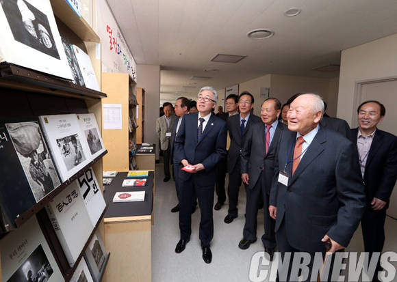 이날 참석한 김종덕 문화체육관광부 장관이 윤주영 전 장관,  김동호 문화융성위원장 등 전·현직 직원들과 도서전을 관람하고 있다. (사진=문화체육관광부)