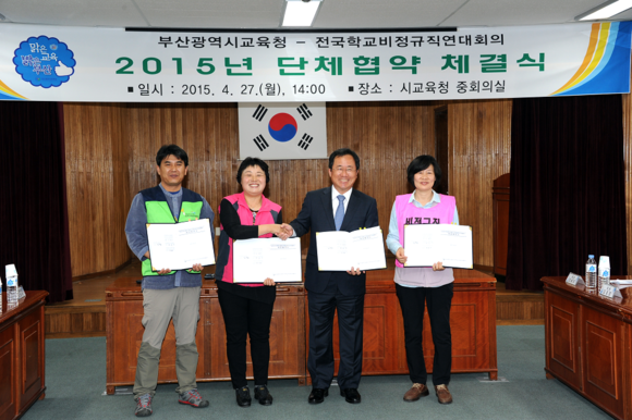 (CNB=최원석 기자) 부산시교육청과 전국학교비정규직연대회의는 27일 오후 2시 시교육청 5층 중회의실에서 단체협약을 체결했다.