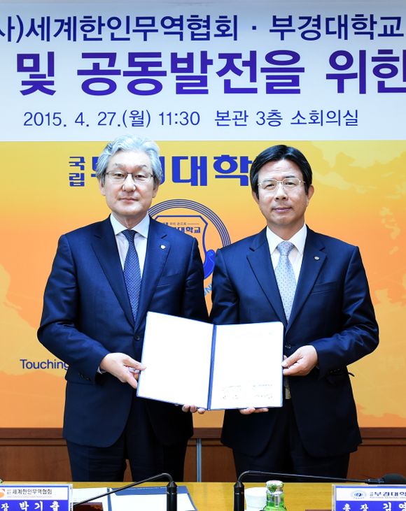 부경대학교(총장 김영섭)와 (사)세계한인무역협회(회장 박기출)는 27일 오전 부경대 대학본부 2층 회의실에서 양 기관 대표들이 참석한 가운데 상호 교류 및 공동발전을 위한 협약을 체결했다.