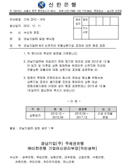 ▲주채권은행인 신한은행은 2012년 12월 채권단에 ‘경남기업 워크아웃 신규자금 분할상환기일 조정에 대한 협조 공문’을 발송했다. 이로 인해 경남기업 대출금 상환은 2015년 6월까지 유예됐다.