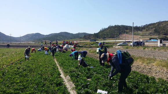 ▲전국섬등산대회에 참가한 등산객들이 전국적으로 유명한 비금 시금치 캐기 부대행사에 참여하고 있다.