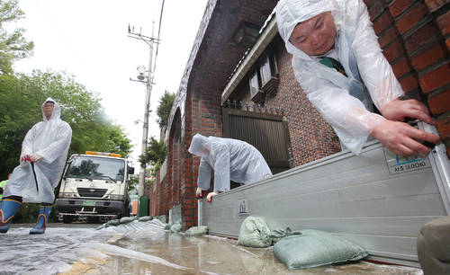 28일 오후 서울 양재동 주택가에서 서초구청 관계자들이 여름철 수해를 대비해 저지대 침수를 막는 차수판 설치 훈련을 하고 있다. (사진 = 연합뉴스)