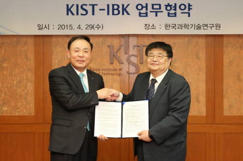 ▲29일 서울 성북구 한국과학기술연구원에서 김영규 기업은행 IB본부 부행장(왼쪽)과 임태훈 한국과학기술연구원 부원장이 협약식을 마치고 기념촬영을 하고 있는 모습. (사진제공=기업은행)