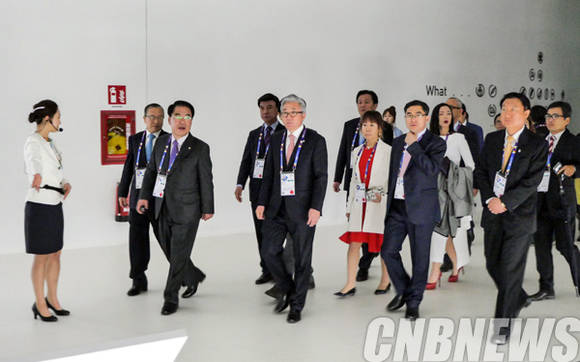 이날 김종덕 문화체육관광부 장관이 주요 내빈들과 함께 밀라노 엑스포장 한국관 야외무대에서 열린 ‘한국관 개관식’ 행사을 마친 뒤에 전시관을 둘러보고 있다.(사진=문화체육관광부)