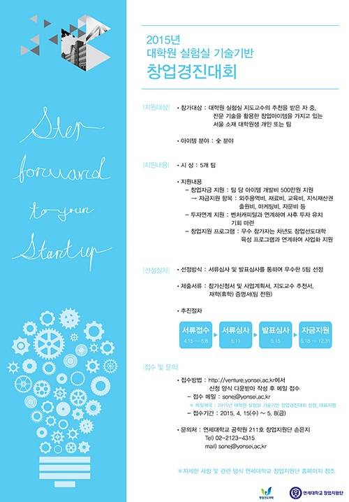 학생 창업을 지원하는 '연세대학교 창업지원단'은 '2015년 대학원 실험실 기술기반 창업경진대회'를 개최해 새로운 ‘아이디어의 보고(寶庫)’를 찾아 나설 계획이라고 밝혔다. 참가접수는 오는 8일까지며 1차 서류심사, 2차 발표심사를 통해 우수한 5팀을 선정한다.
