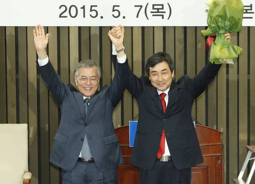 ▲새정치민주연합 문재인 대표와 제4기 원내대표에 선출된 이종걸 의원이 7일 오후 국회에서 열린 의원총회에서 손을 잡고 인사를 하고 있다.(사진=연합뉴스)